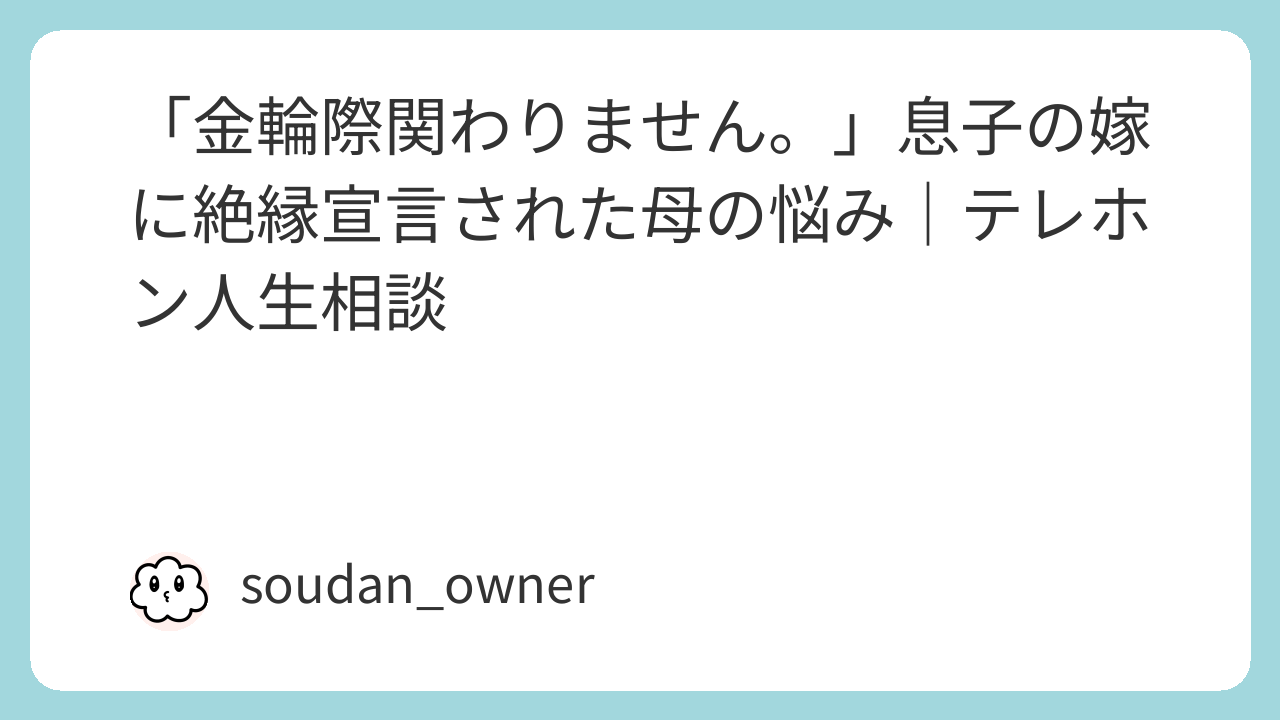 相談者は、30歳の息子が結婚した相手の嫁から、突然「今後一切お付き合いしません」とLINEで絶縁宣言を受ける。理由は「モラハラを受けた」とされるが、相談者自身には心当たりがない。