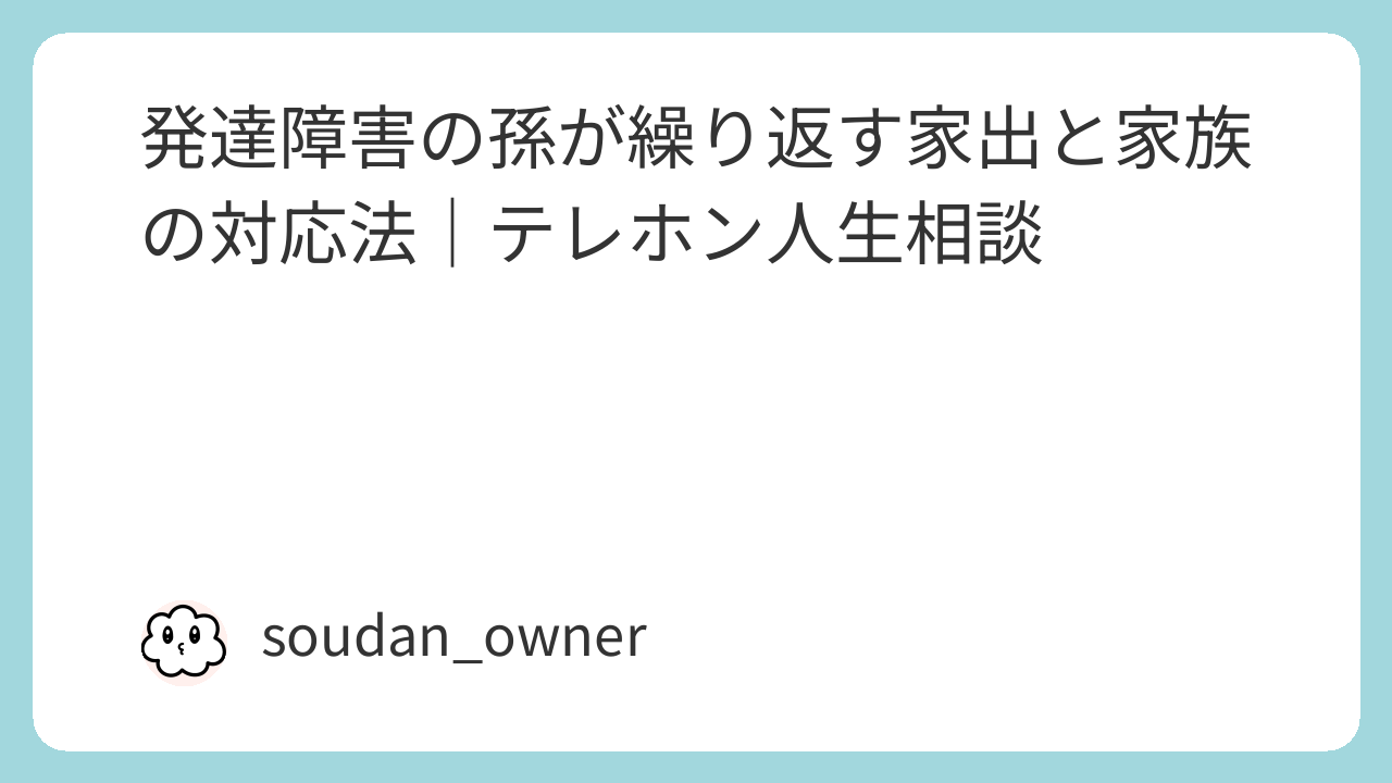 相談者の孫は17歳の発達障害の男子。中学時代から時折家を飛び出すことがあり、最近は2週間ほど家を空けたこともある。自宅から30分ほど離れた駅周辺で野宿やチラシ配りのアルバイトをしていたこともあった。衝動的に家を出てしまうため、親や祖母は精神的・金銭的に大きな負担を抱えている。相談者は「見捨てない」と伝えつつ、どのように支援すればよいか悩んでいる。